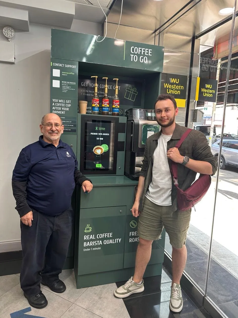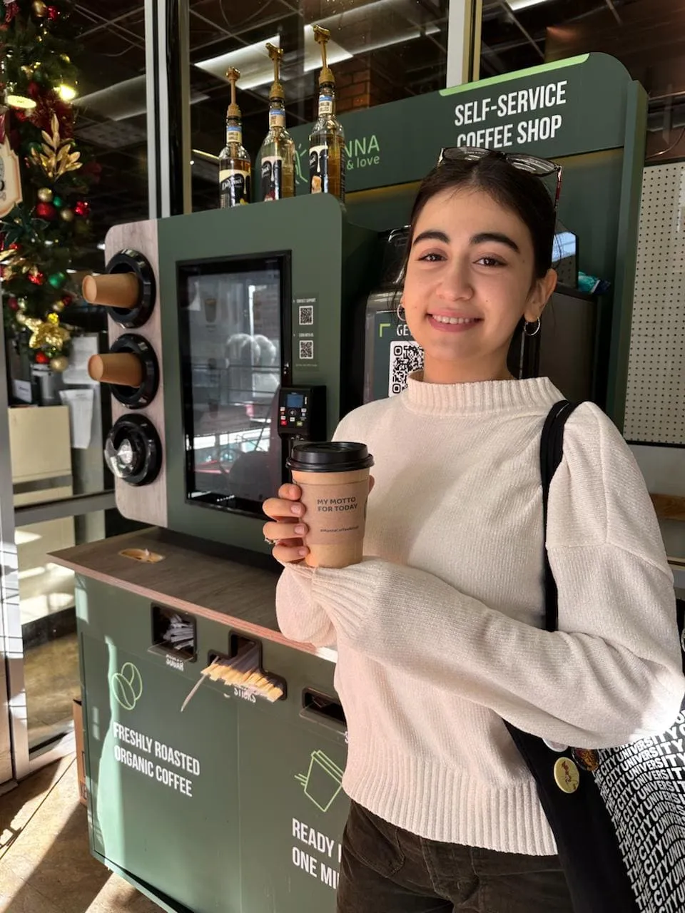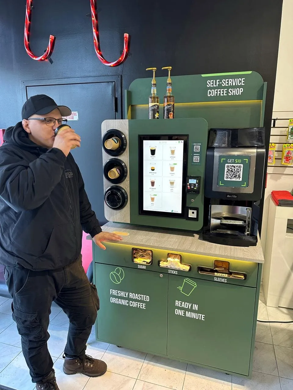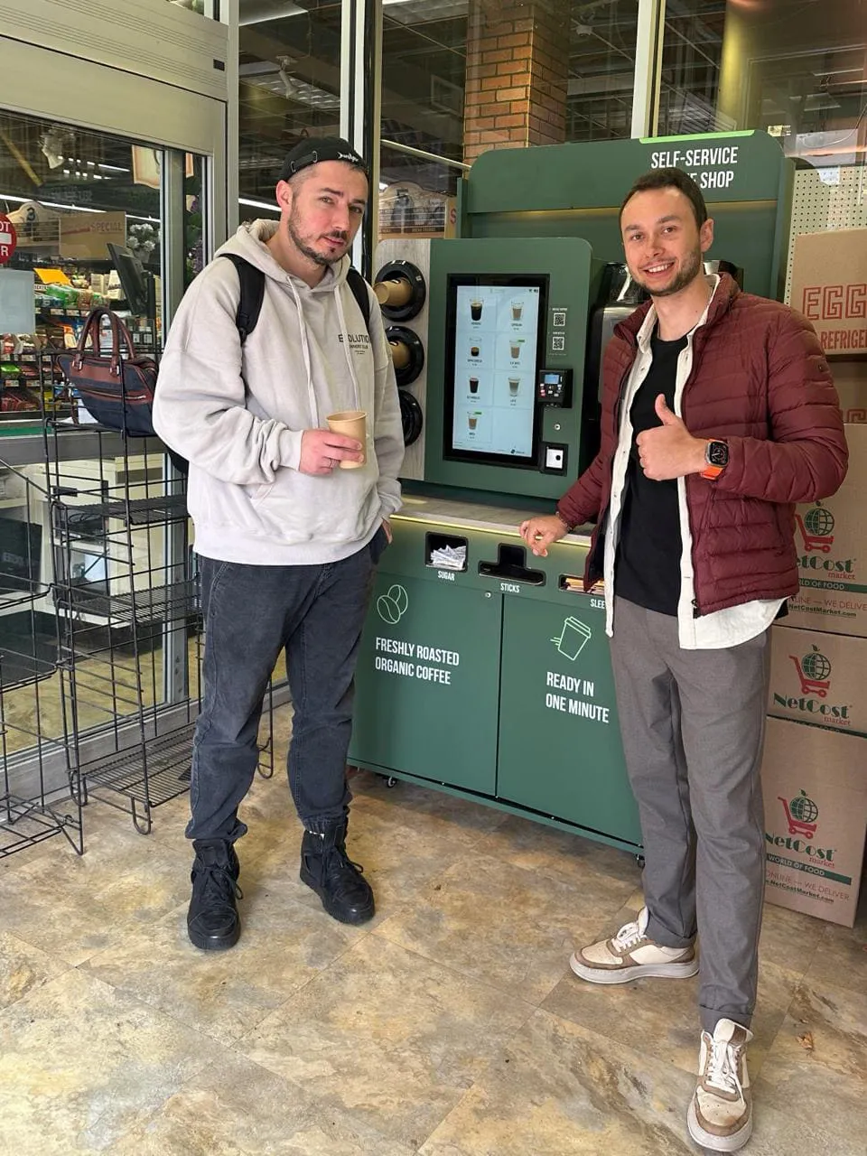 Кофейня оснащена умным микромаркетом, который позволяет дополнительно продавать свежие продукты и снеки.